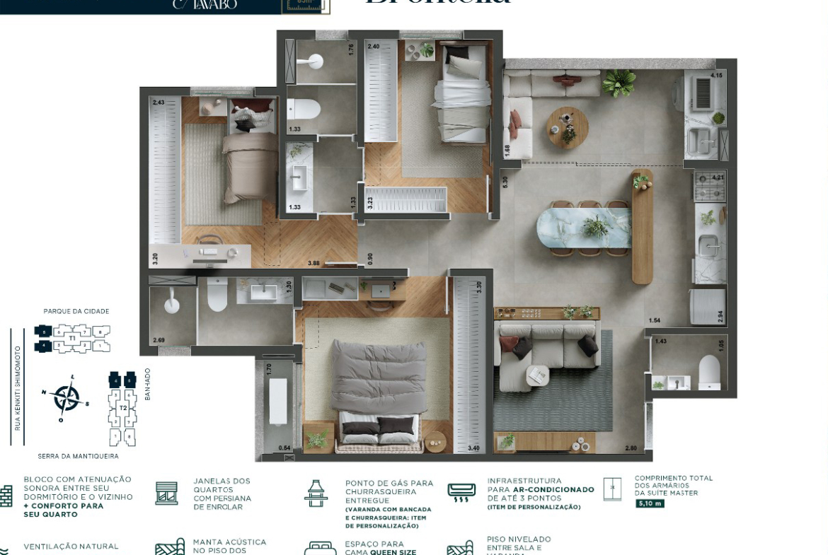 Com 1 suíte e 2 dormitórios ligados por um banheiro americano, esta planta oferece privacidade e funcionalidade em cada metro. A sala integrada à cozinha e à varanda cria um espaço perfeito para convivência, enquanto o layout moderno garante excelente aproveitamento dos ambientes.