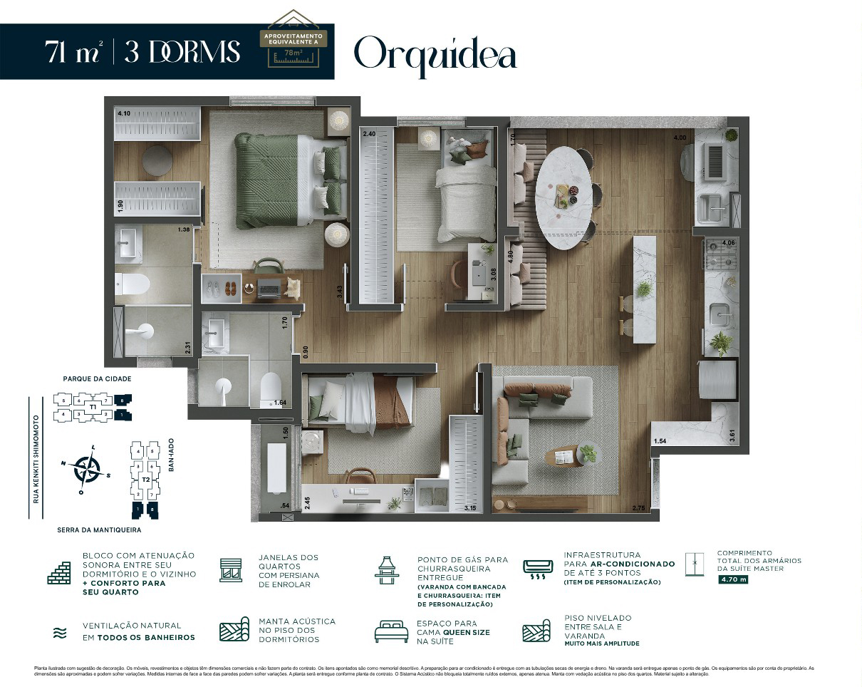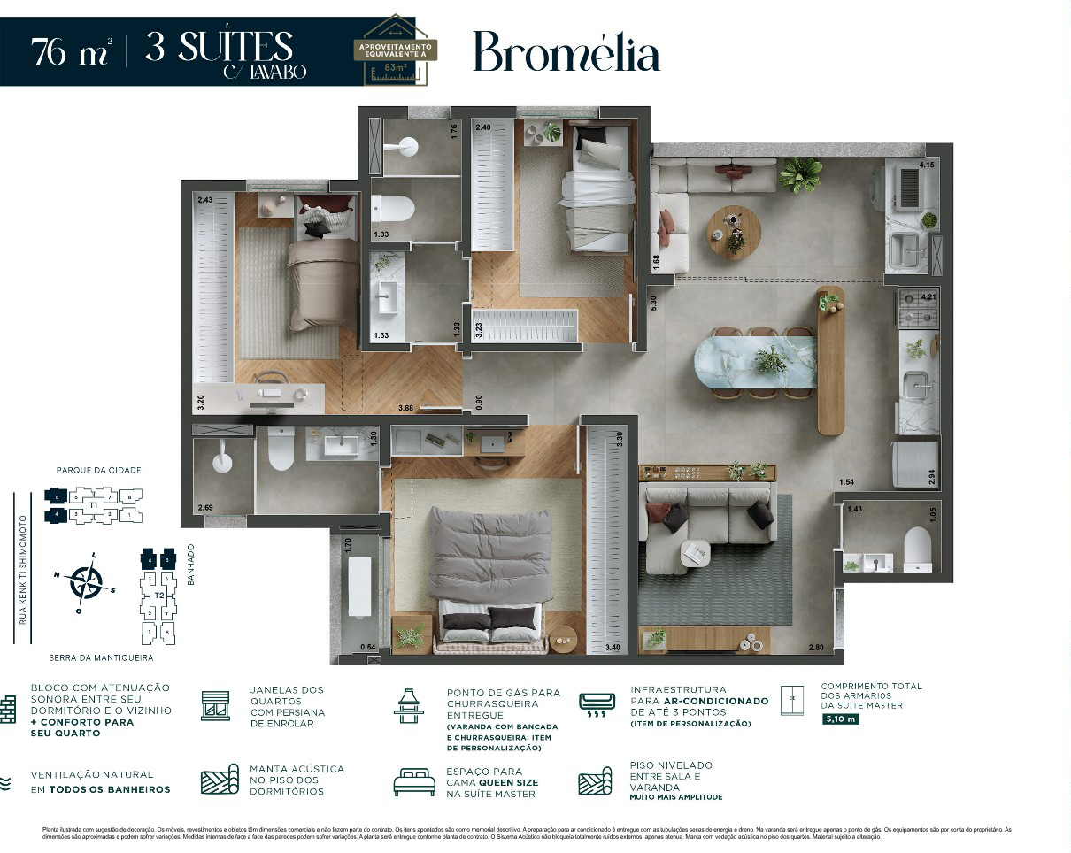 1 suíte, 2 dormitórios com banheiro americano*, sala integrada e varanda, combinando privacidade, praticidade e um design moderno.